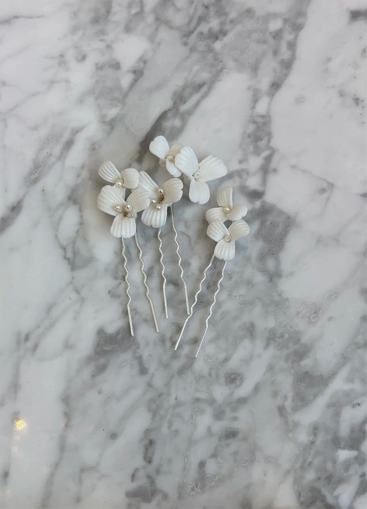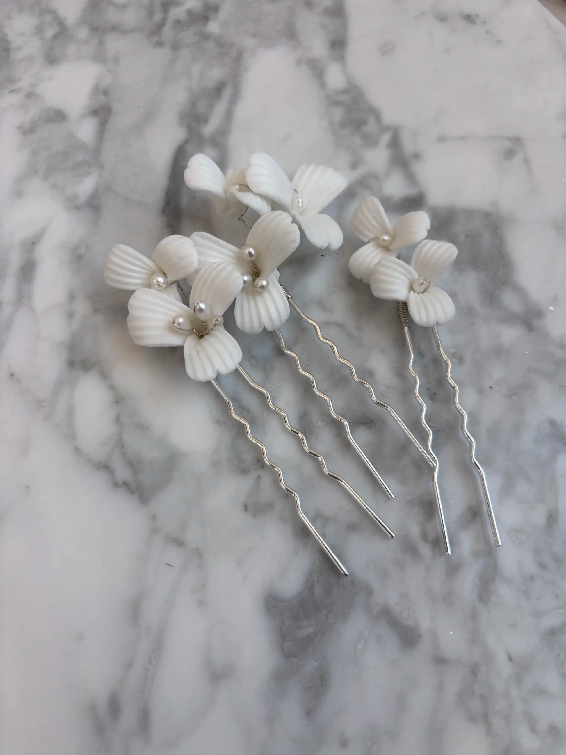 Simplicity and beauty in this set of 3 hair pins. Ivory clay petals with pearl centres these hair pins are on silver metal pins and silver wire.